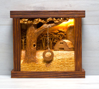 This farm country landscape is hand carved in white pine to a depth of approximately 2". the design is fairly simplistic, but unique in its own way. Aggressive undercutting was done in order to tie the rope for the tire swing, and the barn sits in the distance as a secondary feature. As a kid I always loved swinging on my grandma's tire swing, so this is a throwback to those good old days.